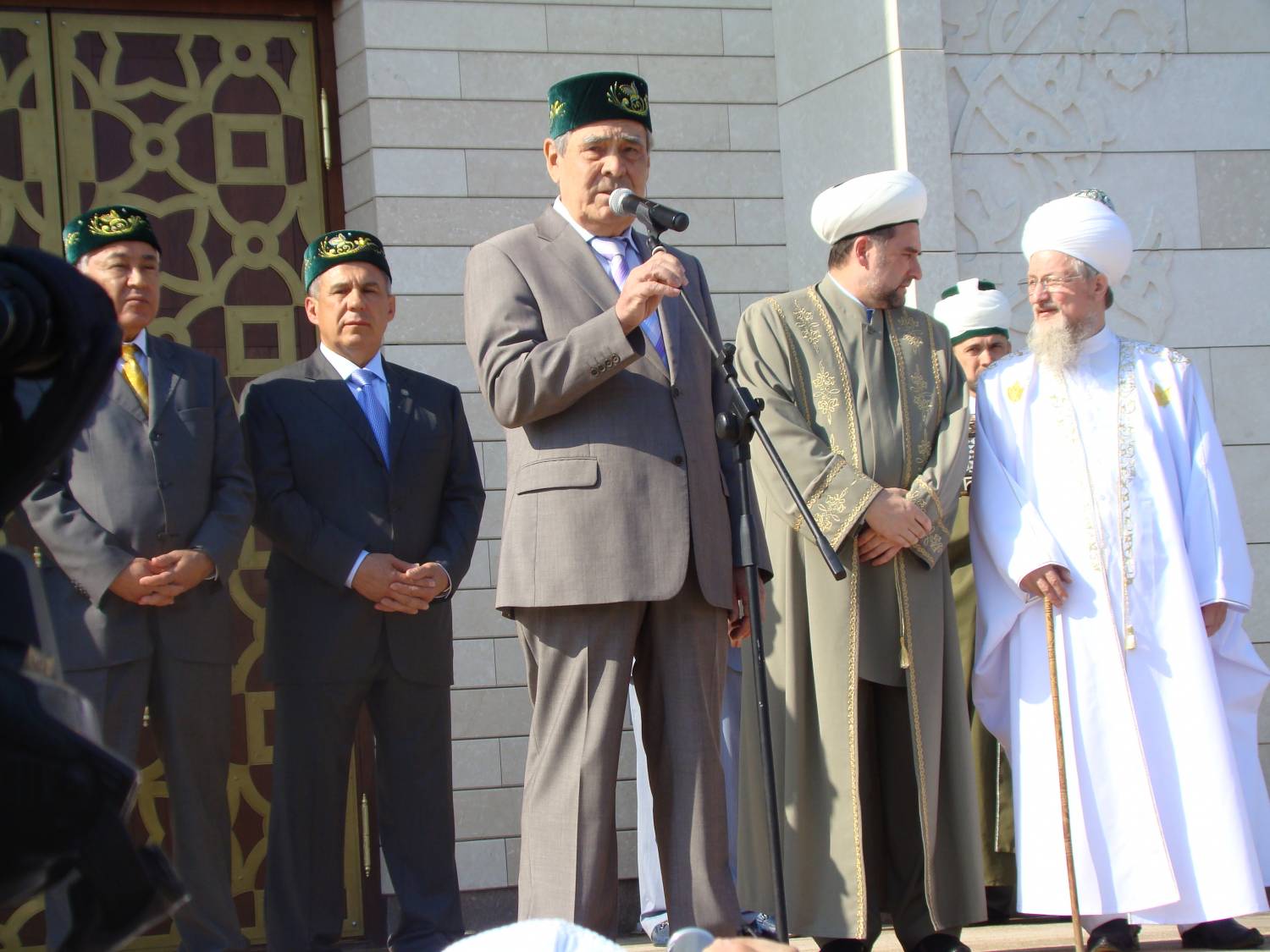 Ислам динен кабул итү билгесе булган истәлекле корылманың ачылу тантанасында Татарстан Президенты Рөстәм Миңнеханов, Дәүләт киңәшчесе Минтимер Шәймиев, Үзәк Диния нәзарәте мөфтие Тәлгат хәзрәт Таҗетдин чыгыш ясады. Татарстан Президенты ислам динен кабул иткән көннең безнең өчен һәрчак истә тотарга тиешле зур бәйрәм икәнлегенә басым ясап сөйләсә, Минтимер Шәймиев исә шушында догаларыбызны кылып, тагын бер кат тарихыбызны искә төшерүнең мөһим булуына ассызыклап бәян кылды. "Кемгәдер ошыймы ул, юкмы, тик тарихны яңадан язып булмый. Ул – безнең ата-бабайларның язмышы”.-дип билгеләп узды М. Шәймиев. Аннары ул тиздән Болгарда ачылачак мәчетнең хәзергә исеме булмавы,"Ак мәчет” дигән исемнең ошавы турында игълан итте.